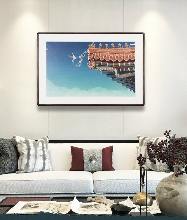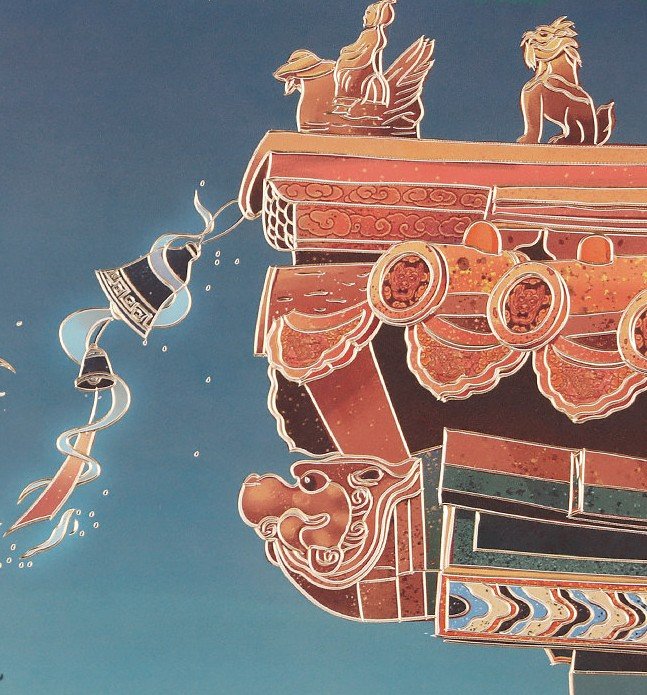 Architectural Detail: The classical building at the center of the composition is rendered with the care of a portrait. The upturned eaves, the tiled roof, the ornamental ridges—each element is carved with a sense of weight, of history, of the quiet dignity of architecture that has stood for centuries.