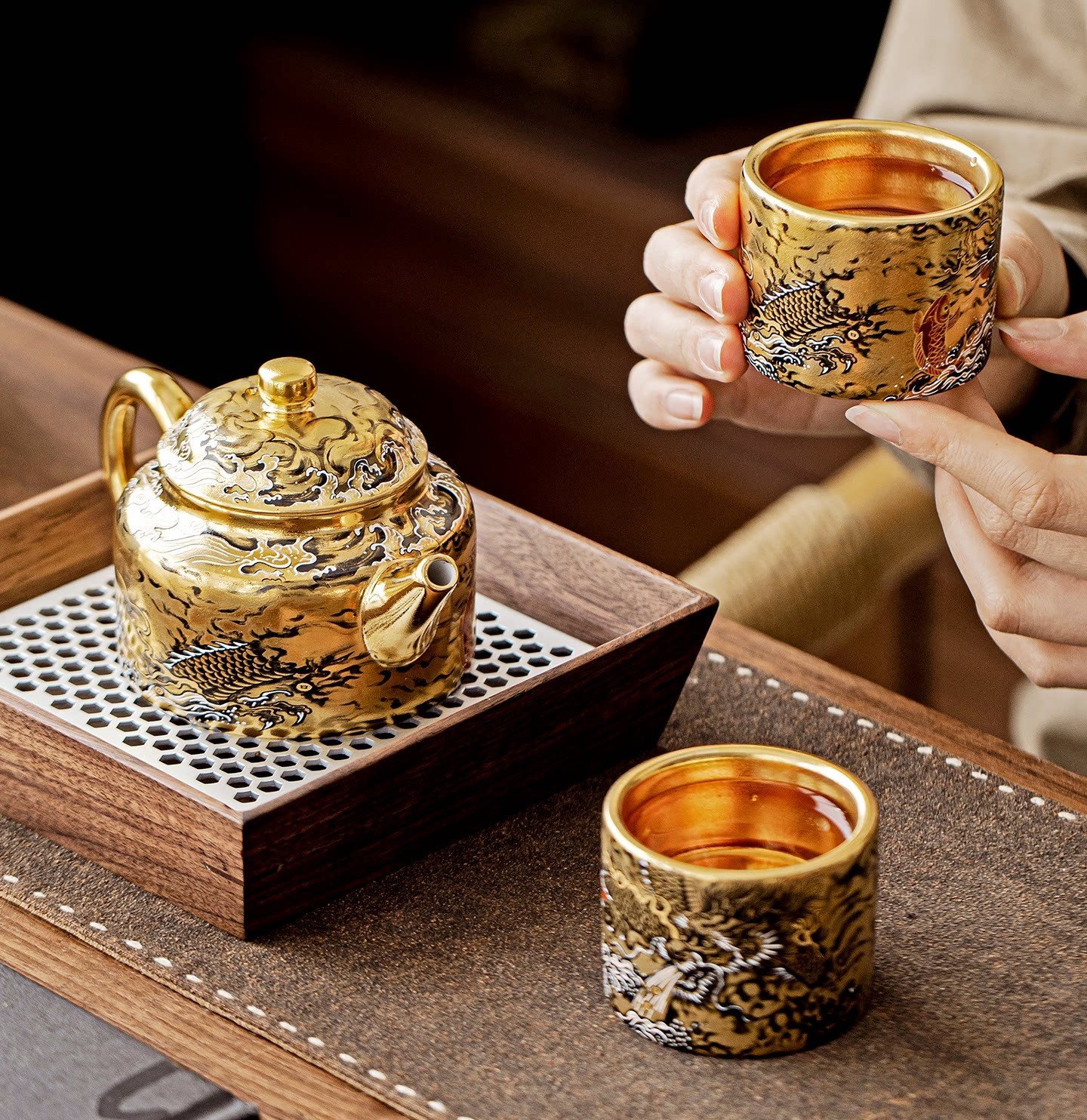 Dehua has produced fine ceramics for over a thousand years, famous for its pure white “blanc de chine” body. For these tea sets, artisans start with high‑grade Dehua clay, shape each piece by hand, then apply intricate hand‑painted motifs in iron‑oxide underglaze – dragons, phoenixes, fish, and mythical birds. A second firing at 1300°C seals the design. Finally, the interior is coated with genuine gold using the ancient Chinese gilding technique (鎏金) – a process of mixing gold with mercury, applying it to the fired ceramic, then heating until the mercury evaporates, leaving a pure gold layer that is polished to a brilliant, food‑safe shine. The result is a tea set that is both resplendent and enduring.