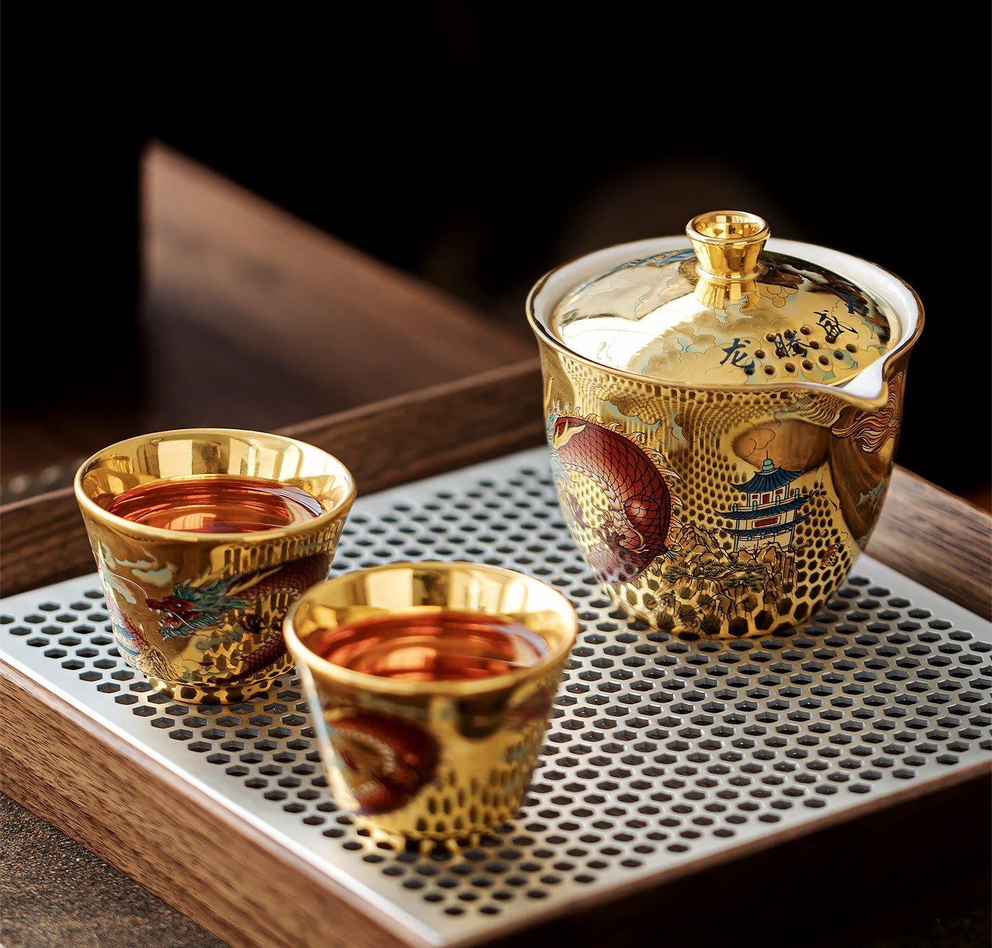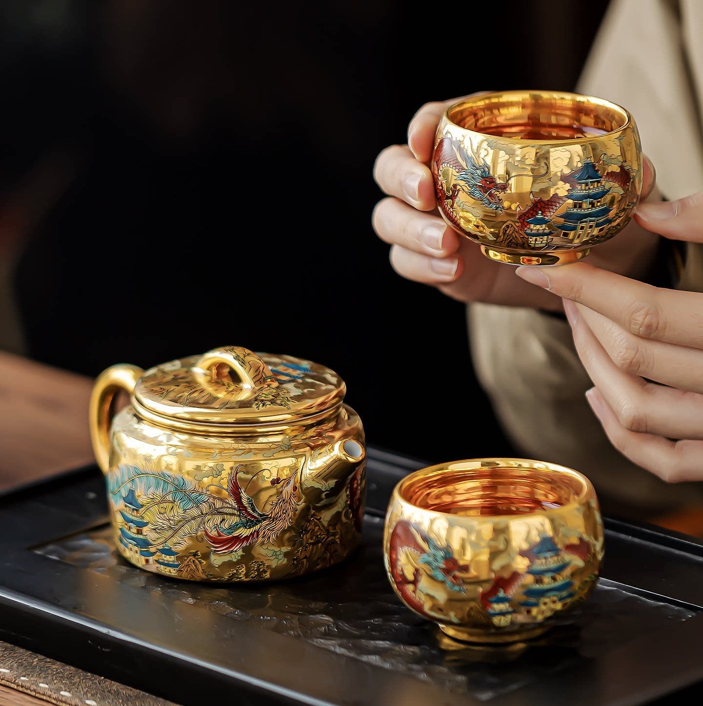 “Ink Dragon in Clouds” – A black dragon painted with iron pigment swirls across the white porcelain, half‑hidden in mist. When filled with tea, the golden interior illuminates the dragon from within. This set echoes the single cup design but as a full service.