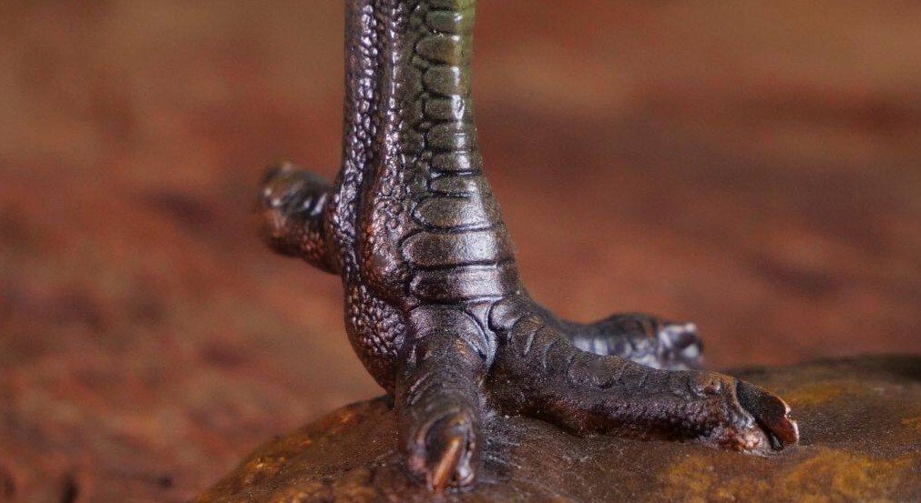 Feathers of Precision: The plumage is carved with extraordinary fidelity. The tail feathers arch in layered curves, each one distinct, their edges subtly textured. The breast is rendered with the soft fullness of living flesh, the feathers overlapping in natural rhythm. The comb and wattles are sculpted with the delicate texture of the living bird.