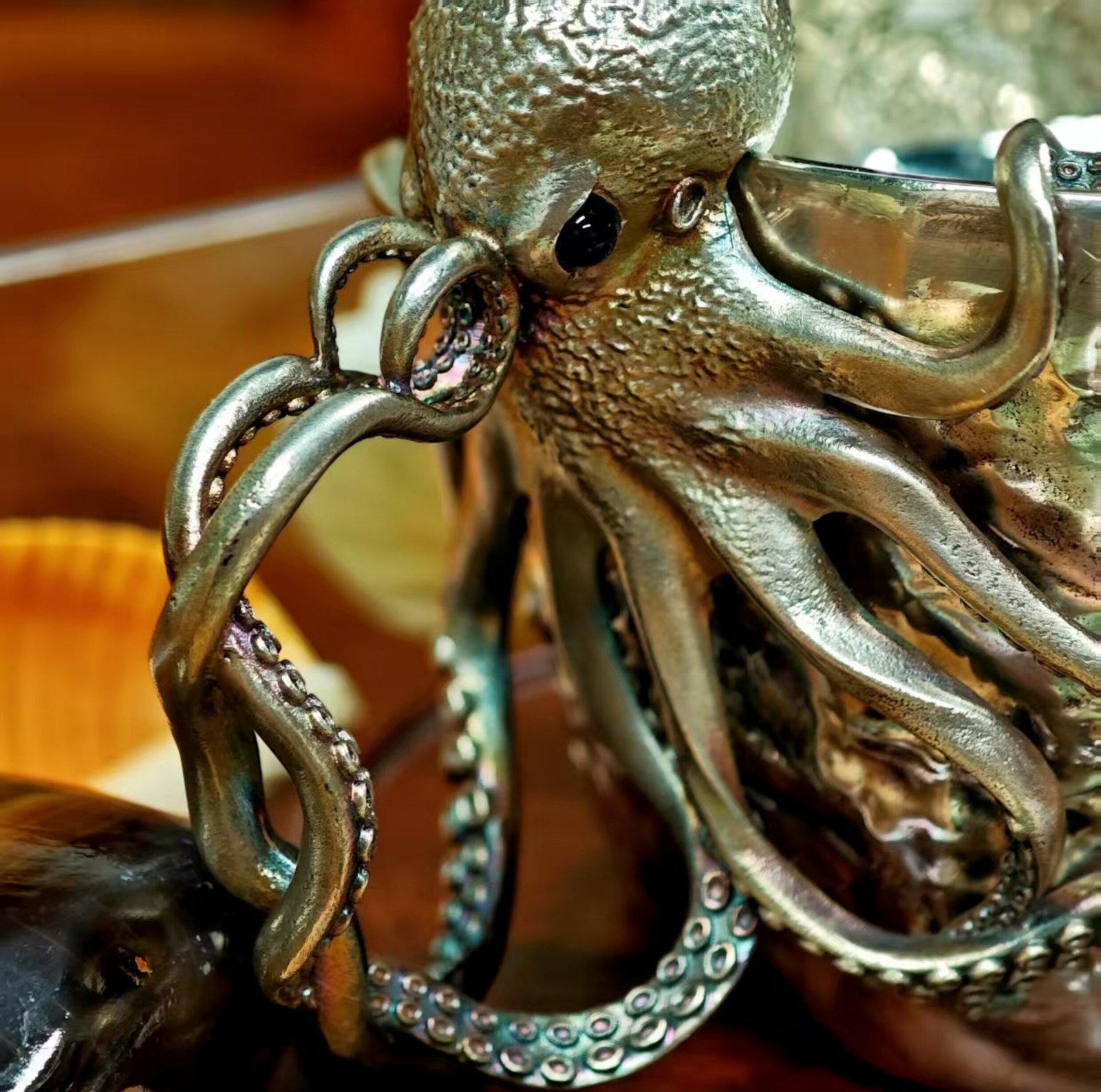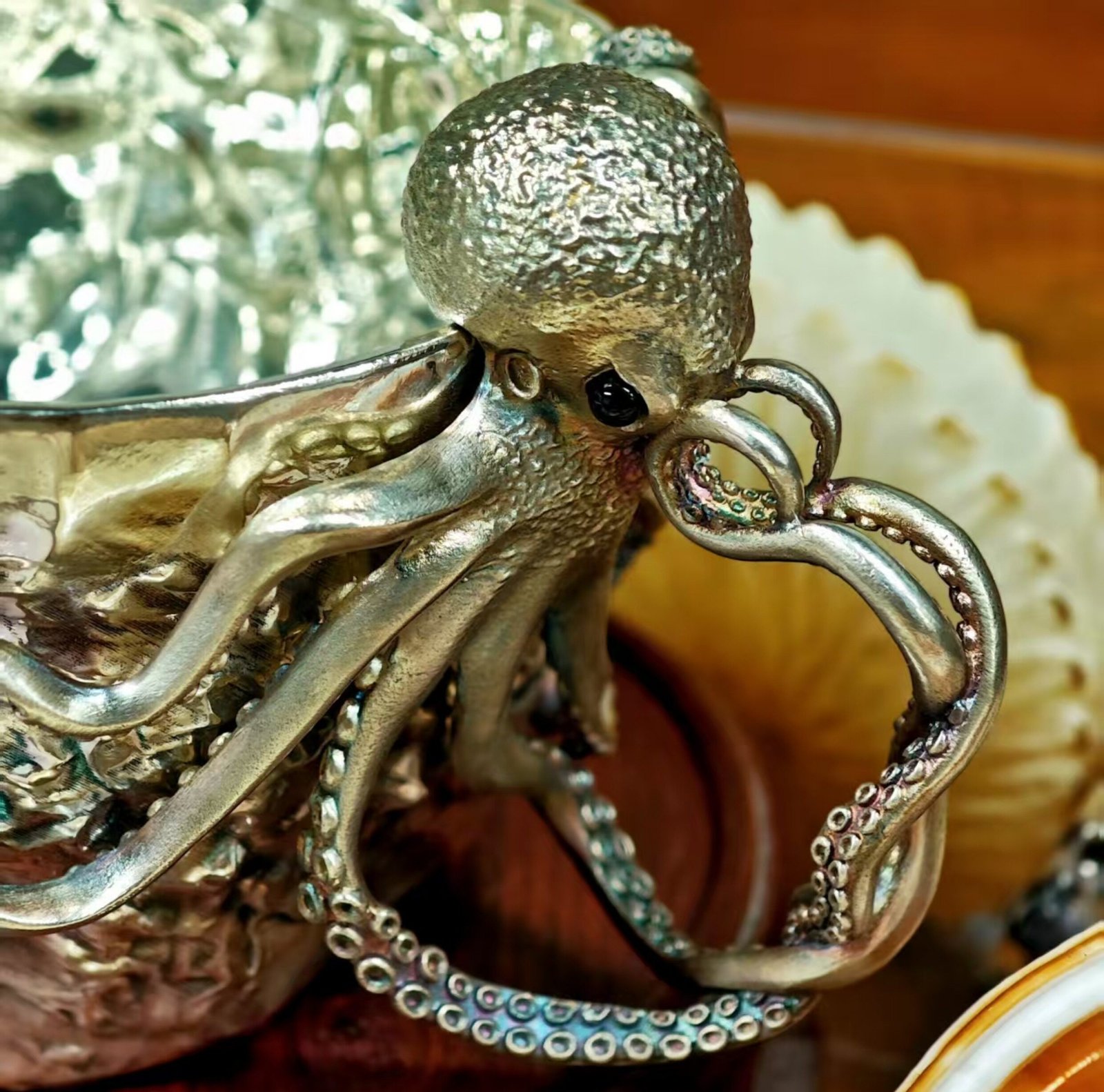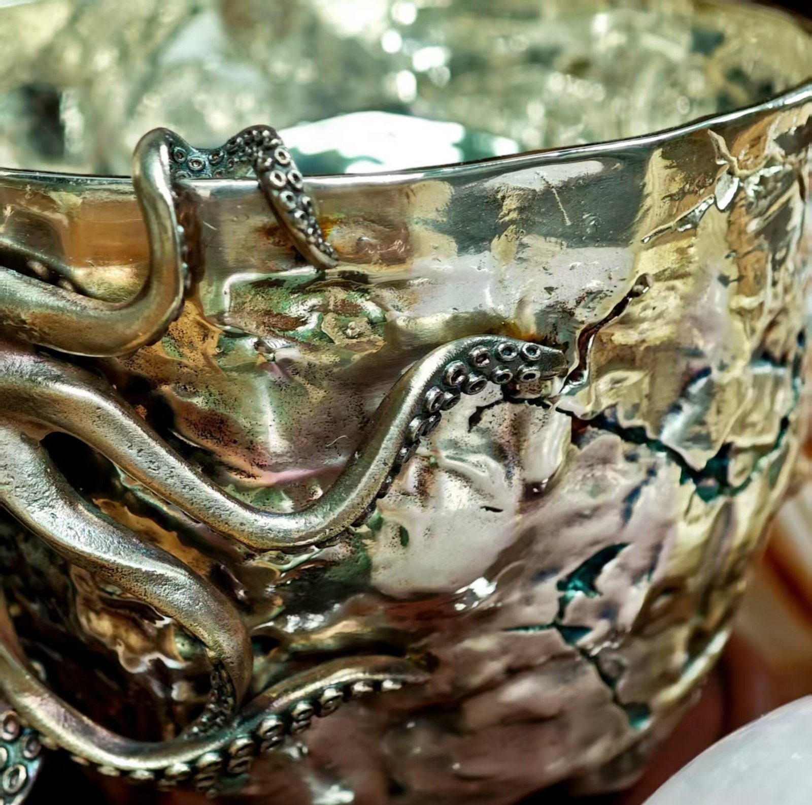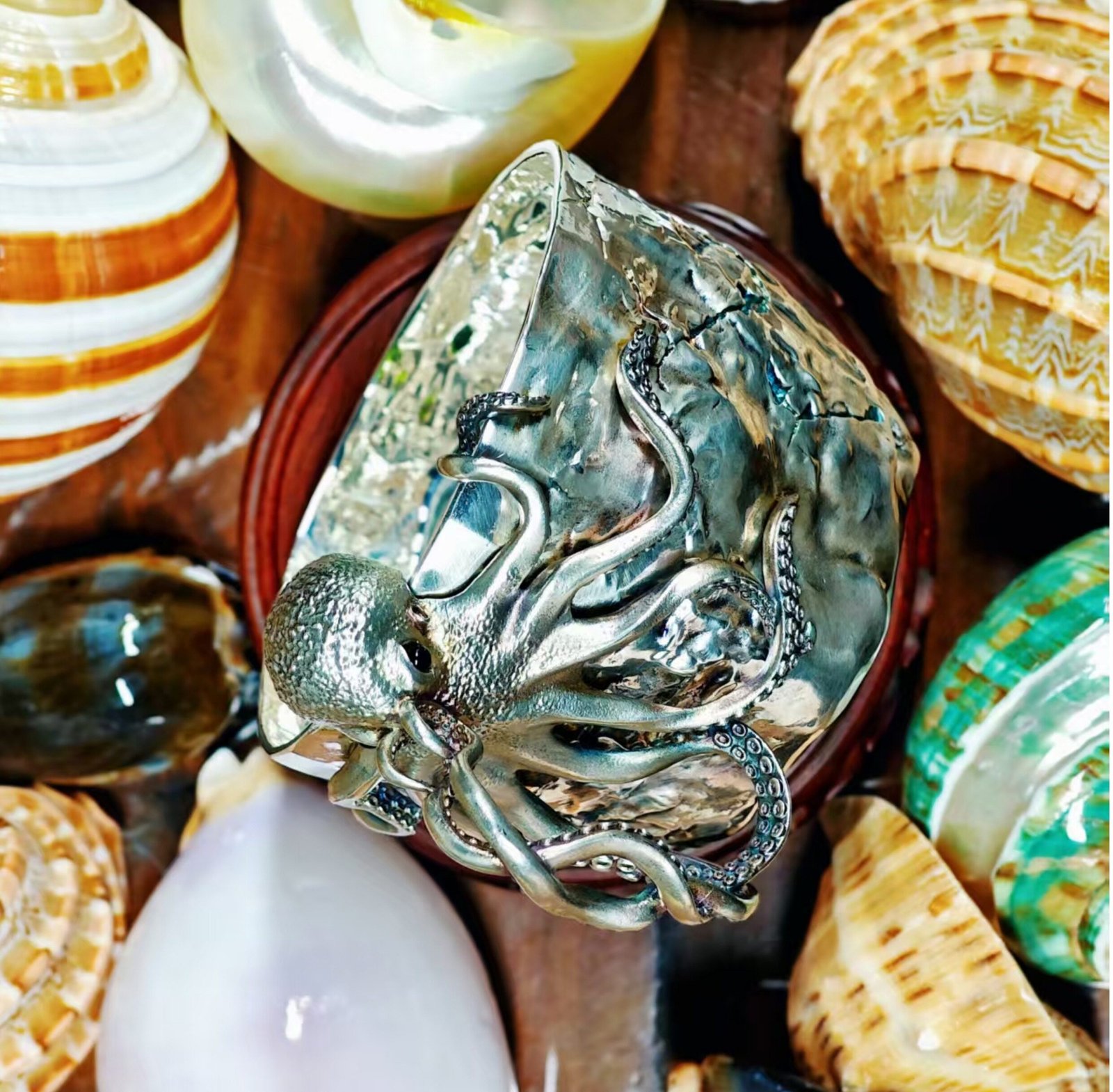 Each cup is individually cast using the lost‑wax method, then hand‑finished. The octopus’s tentacles are delicate; while they are strong enough for daily use, we recommend gentle handling. Over time, the silver will naturally oxidize, creating beautiful dark highlights in the crevices – a feature that many collectors prize.