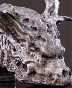 Powerful Form: The elongated, powerful shape of the dragon’s skull is immediately recognizable, from its fierce brow and the empty sockets where its eyes once blazed, to the powerful curve of its jaw and the suggestion of its horns.