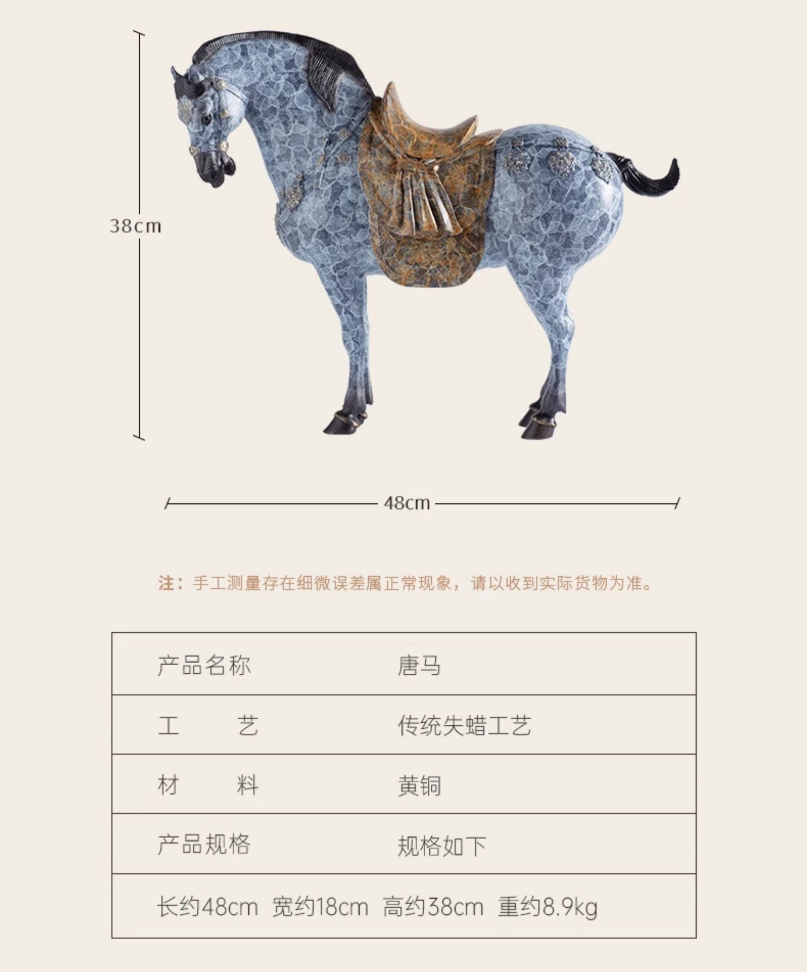 Each piece is handcrafted using the lost‑wax method, a meticulous process involving multiple stages of casting, polishing, and patination. The high‑temperature patina is applied by hand, resulting in subtle variations in color and texture that are not flaws but the unique signature of the artisan’s touch. Please note: this is a solid brass sculpture inspired by the form of Tang sancai horses, not a ceramic piece.