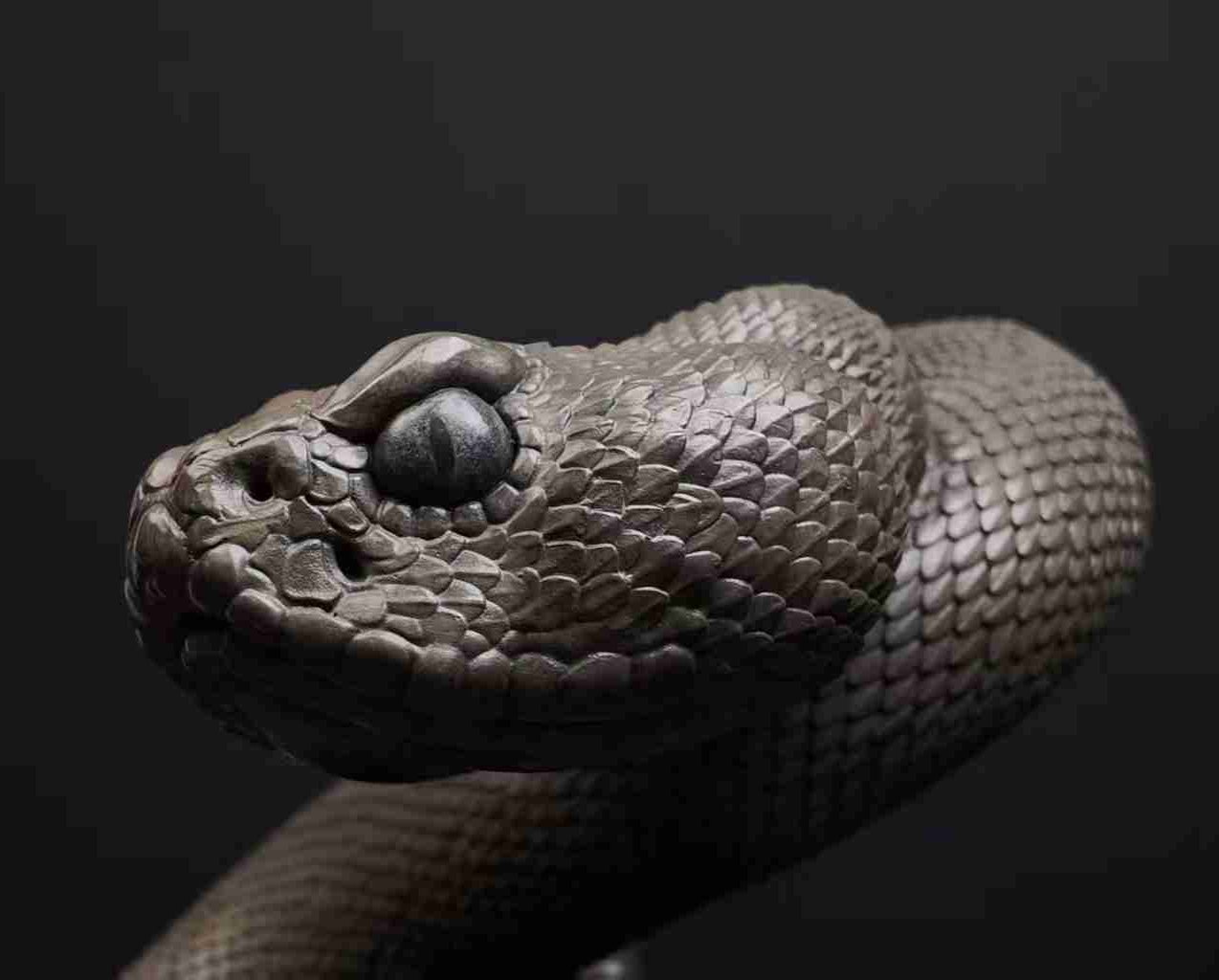 The Head of Vigilance: The snake’s head is sculpted with anatomical accuracy—the broad, triangular shape of the pit viper, the eyes set forward, the nostrils flared, the mouth closed in a line that suggests neither aggression nor retreat. The rattles at the tip of the tail are rendered with delicate precision, each segment distinct, a silent reminder of the creature’s signature warning.