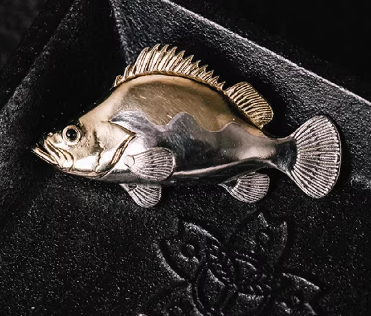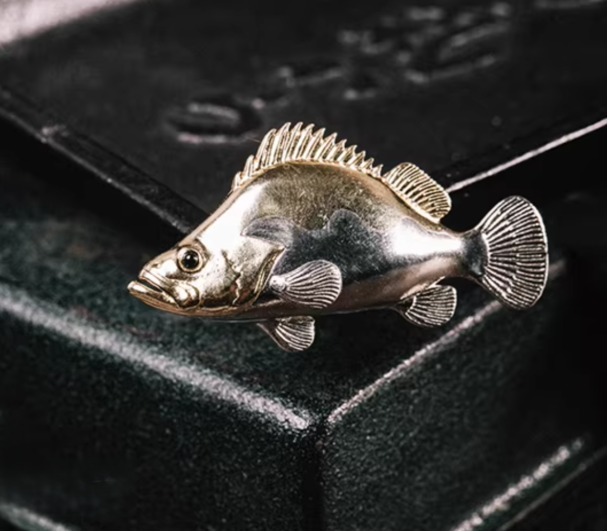 • Solid Brass & White Copper: The brooch is cast in a combination of warm, golden brass and cool, silvery white copper, creating a subtle two-tone effect that highlights the fish’s form. The surface is polished to a soft luster, with the texture of the scales suggested rather than overstated.