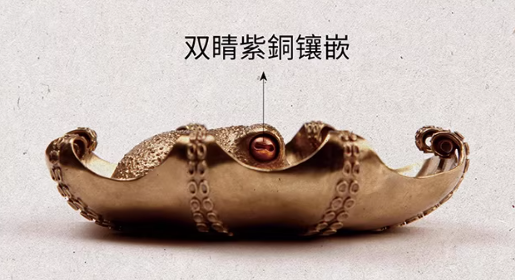 The Octopus Form: The octopus’s arms are sculpted with organic fluidity, each one curving differently, each one textured with the delicate patterns of the creature’s skin. The eyes are set with purple copper inlays, catching the light with a quiet, watchful gleam.