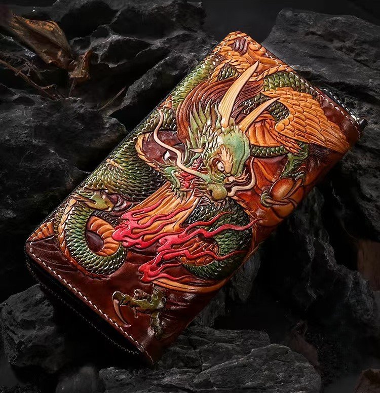 In Chinese tradition, dragons are not creatures of destruction, but of protection. They guard the thresholds of temples, watch over the gates of cities, and accompany those who carry them into the world. This wallet brings that spirit to your pocket. A pair of hand-carved dragons coil across the surface, their bodies intertwined in a dance of strength and grace. Every scale is individually tooled, each one catching the light differently, creating a surface that seems alive. The dragons are not merely decorative; they are guardians—a reminder that what you carry close to you is worth protecting.