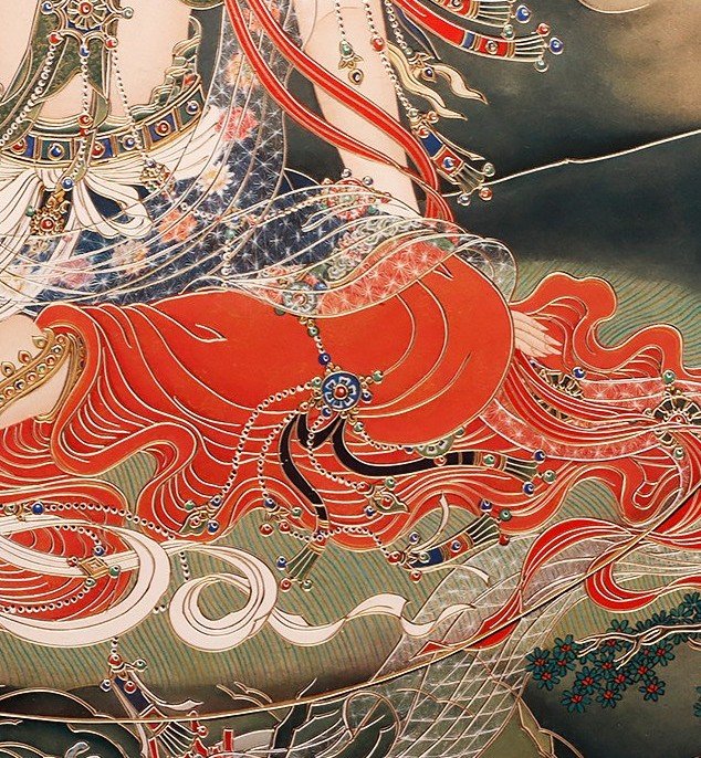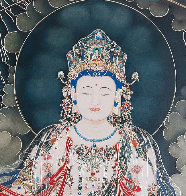 The Moon Halo & Setting: Behind Guanyin, a full-moon nimbus radiates light, its surface subtly textured to suggest the luminosity of the moon itself. Around the figures, a landscape emerges—rocky cliffs, bamboo groves, drifting clouds—evoking the “quiet valley, lush with trees” described in the Avatamsaka Sutra.