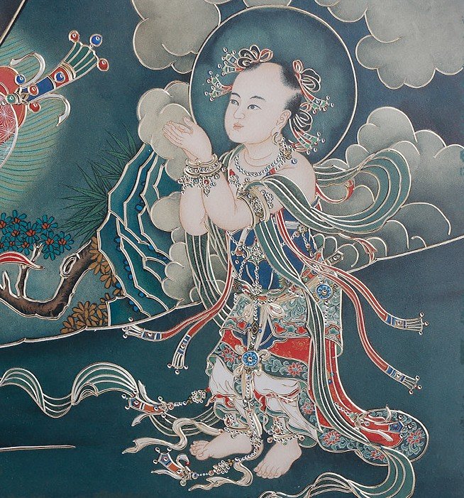 Sudhana (善财童子) , the young pilgrim who sought enlightenment across fifty-three masters, kneeling with palms pressed together, his expression one of pure devotion.