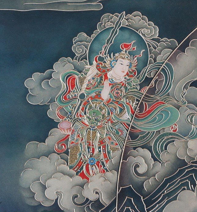 The Sacred Assembly: Surrounding the central figure are the traditional companions of the Water-Moon Guanyin, each rendered with the same painstaking care: